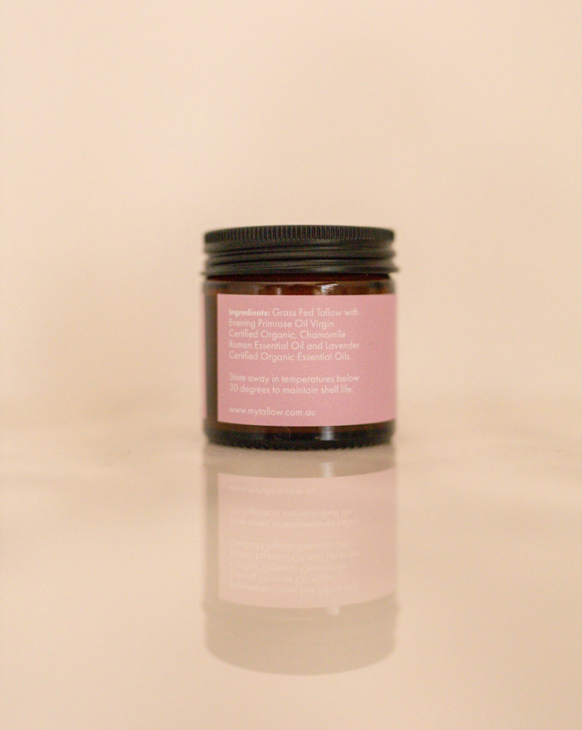 Treat your skin to the gentle touch of Chamomile & Lavender, a deeply restorative blend of grass-fed tallow, certified organic evening primrose oil, and calming essential oils of Roman Chamomile and Lavender. This luxurious formula is perfect for your evening skincare ritual, helping to relax the mind and renew the skin.